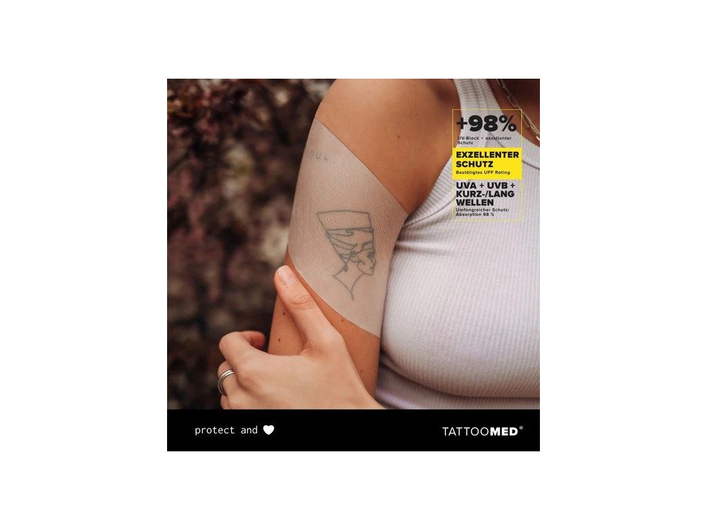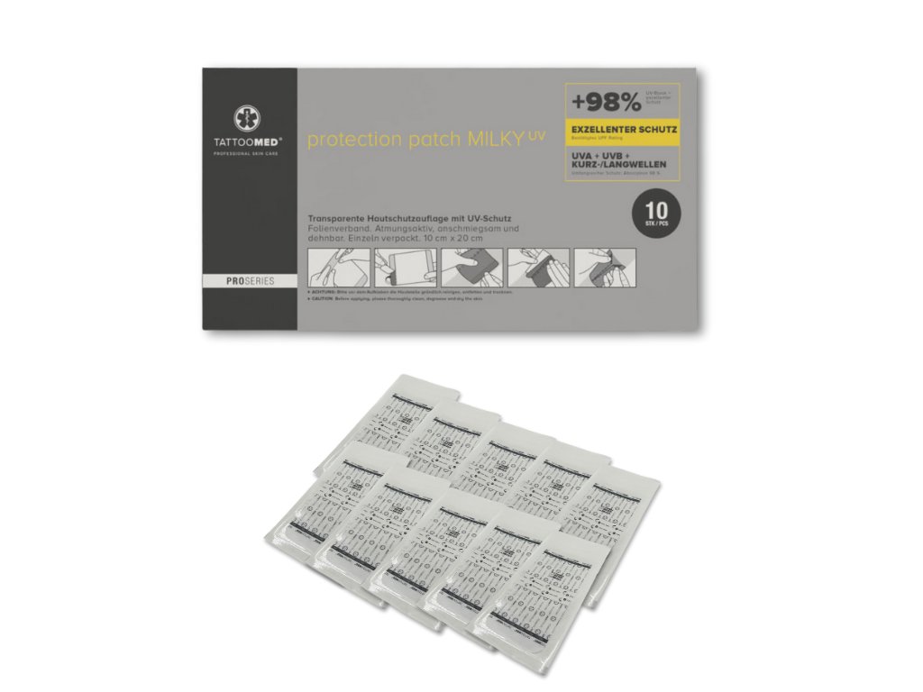 S nově revidovanou náplastí TattooMed Protection milky nejen chráníte svou pokožku po tetování před kontaminací, suchostí a choroboplodnými zárodky, ale mléčná náplast slouží také jako spolehlivá UV ochrana a nepropouští žádné škodlivé záření. Také optimálně podporuje péči a je voděodolná a prodyšná.