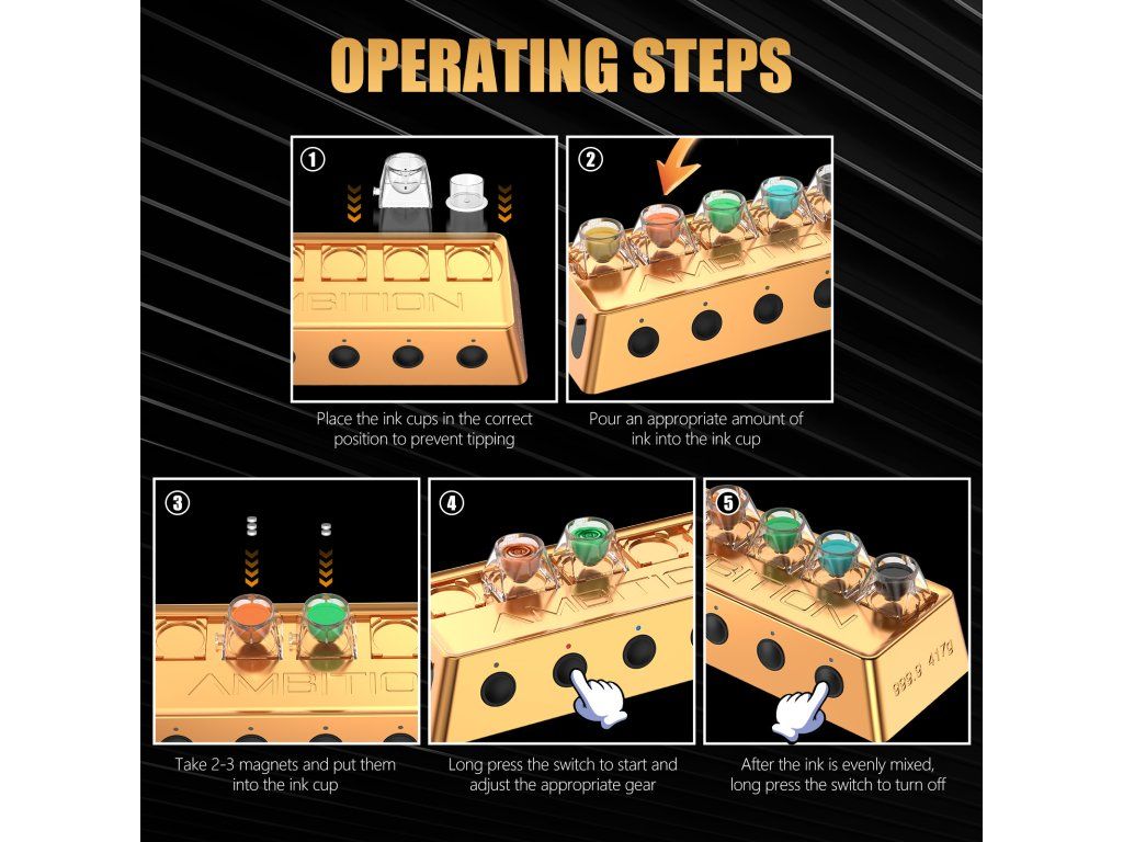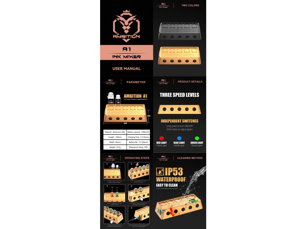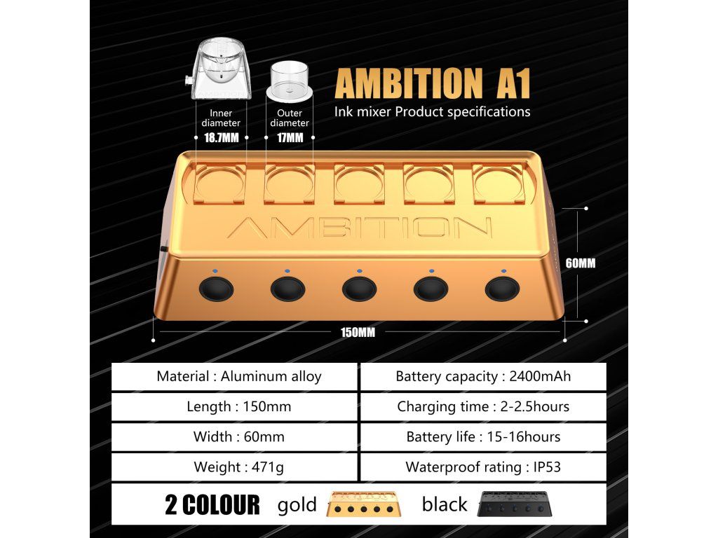 Ambition A1 je kompaktní automatický mixér pigmentů dostupný v černé i zlaté variantě. Umožňuje rychlé a rovnoměrné promíchání inkoustů, PMU pigmentů i dalších tekutých směsí bez nutnosti ručního míchání.