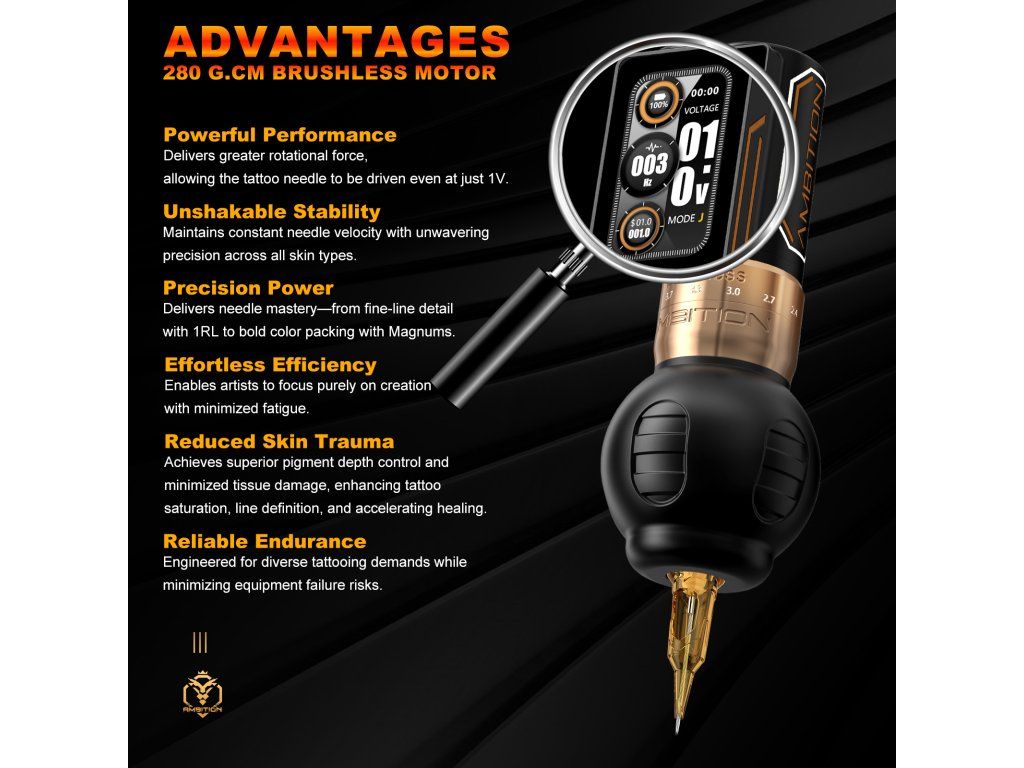 Ambition Ninja Max 280 Dual Battery je bezdrátový tetovací strojek s vysokým výkonem, nastavitelným zdvihem 2,4 až 4,5 mm a 2 bateriemi v balení. Černá varianta je určená pro tatéry, kteří chtějí spojit silný motor, širší rozsah nastavení a možnost přizpůsobit si úchop i charakter práce.
