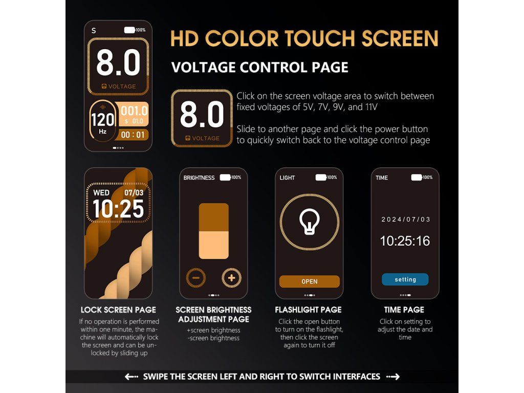 Rychlé ovládání napětí i doplňkových funkcí přímo na barevném displeji.