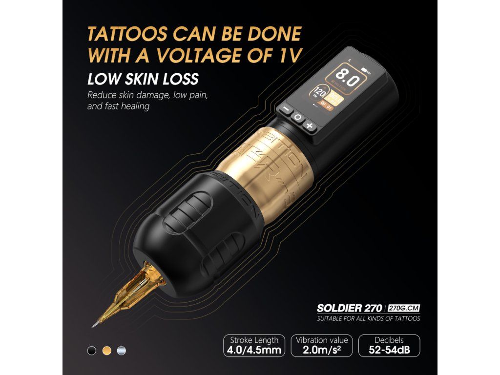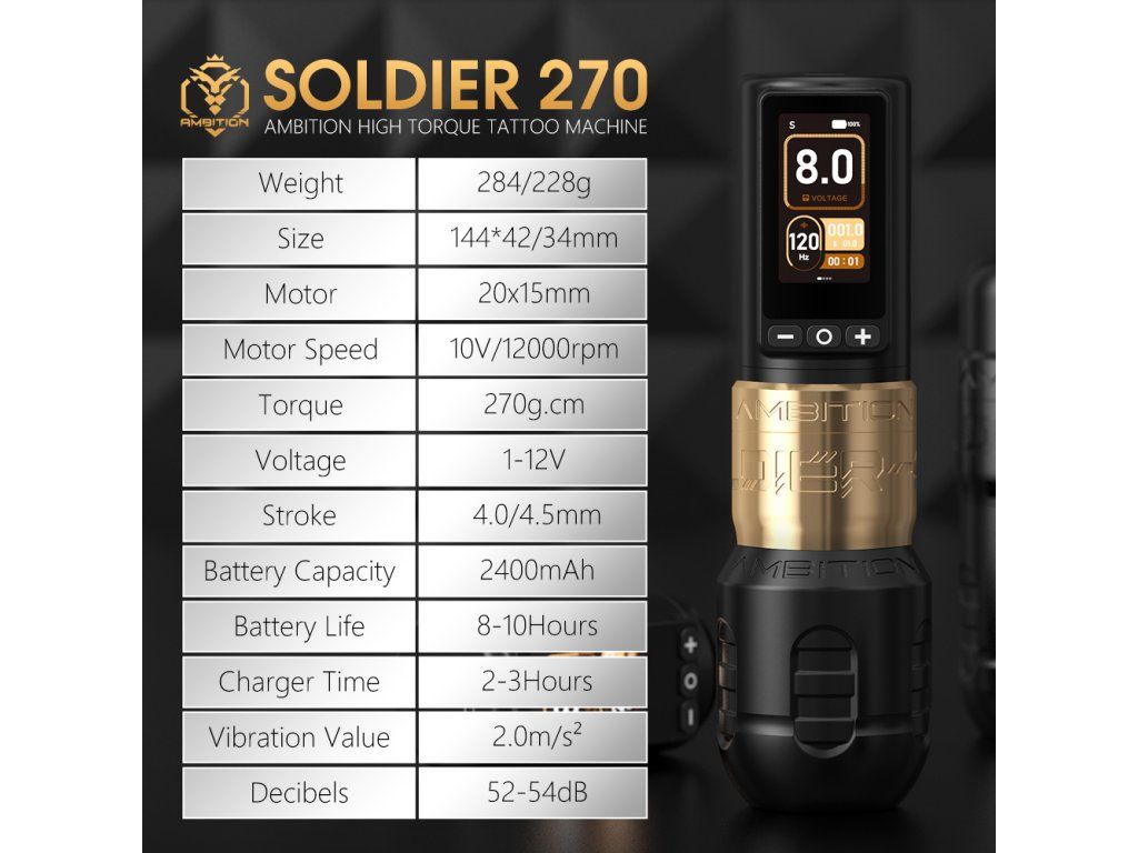 Ambition Soldier 270 Dual Battery je bezdrátový tetovací strojek s vysokým točivým momentem, dotykovým displejem a 2 bateriemi v balení. Černá varianta je vhodná pro tatéry, kteří chtějí stabilní výkon, delší provoz a větší jistotu při delších sezeních.
