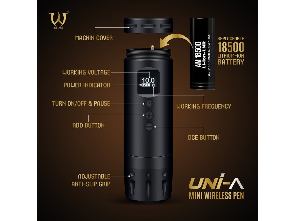 AVA UNI A v černém provedení se zdvihem 3,5 mm je kompaktní bezdrátový tetovací strojek pro každodenní použití. Díky krátkému tělu, OLED displeji a vyměnitelné baterii se hodí do studia i na cesty.