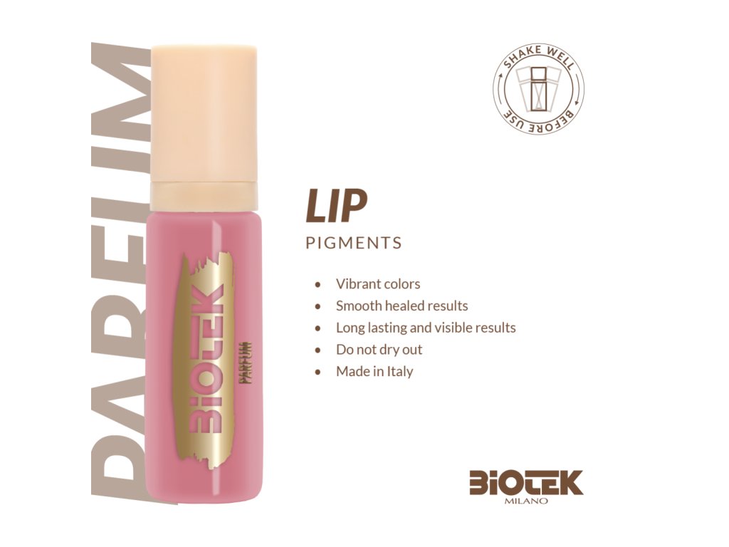 Pigment Biotek Parfum 15 ml je určen pro techniky permanentního make-upu a microbladingu rtů. Odstín „Parfum“ je definován jako jemný starorůžový tón, který vykazuje neutrální podtón umožňující univerzální aplikaci. Produkce probíhá v Itálii z vysoce kvalitních surovin. Pigment je veganský, netestovaný na zvířatech a splňuje regulace EU (např. REACH). Díky své formulaci nabízí plné krytí a barevnou stabilitu po zahojení, minimalizuje nechtěné barevné posuny a je vhodný pro širokou škálu klientů.