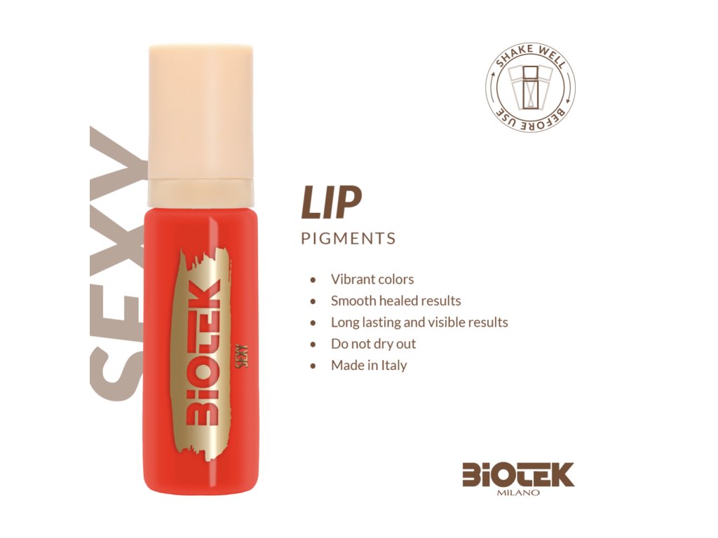 Pigment Biotek Sexy je navržen pro techniky PMU rtů a poskytuje klasický červený odstín „lipstick red“, který zanechává výrazný a stabilní efekt. Vyrábí se v Itálii z vysoce kvalitních surovin, má veganské složení a není testován na zvířatech. Díky své formulaci zaručuje plné krytí a barevnou stálost bez nežádoucích podtónových posunů po zahojení.