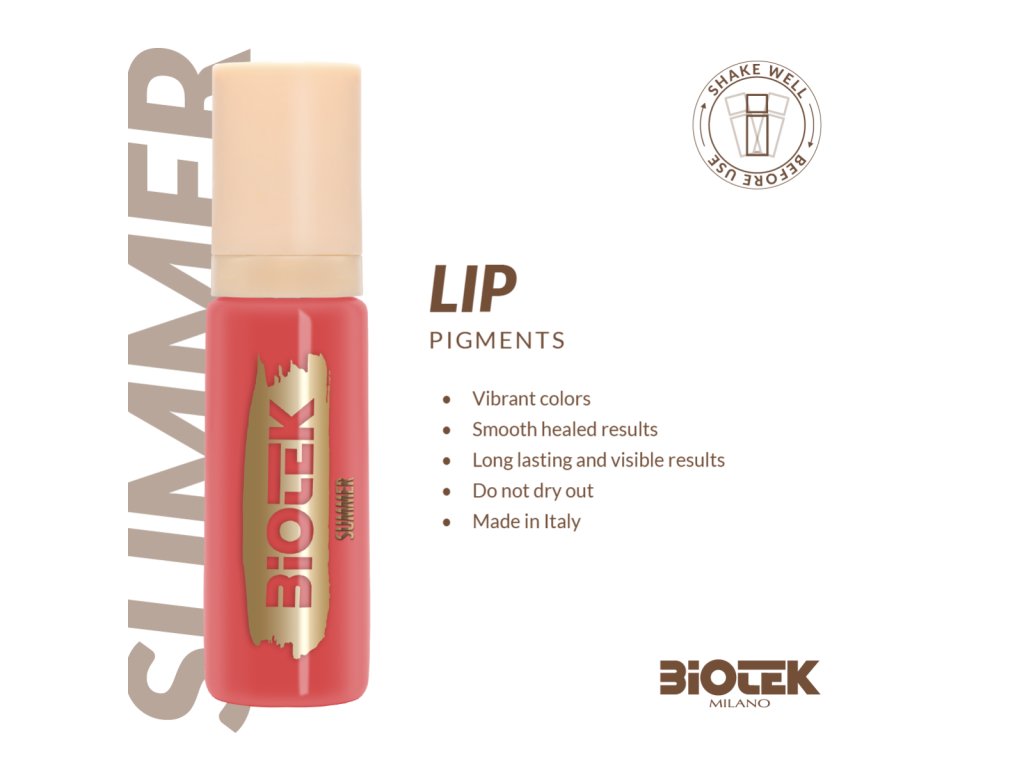 Pigment Biotek Summer 15ml nabízí odstín, který se pohybuje mezi růžovou a červenou s korálovým nádechem. Barva má krémovou konzistenci, je připravena k okamžitému použití bez nutnosti ředění či modifikací. Výroba probíhá v Itálii z vysoce kvalitních surovin, pigment je veganský a netestovaný na zvířatech. Jeho formulace zajišťuje plné krytí, stabilní barevný výsledek po zahojení a hladký, bezskvrnný vzhled rtů.