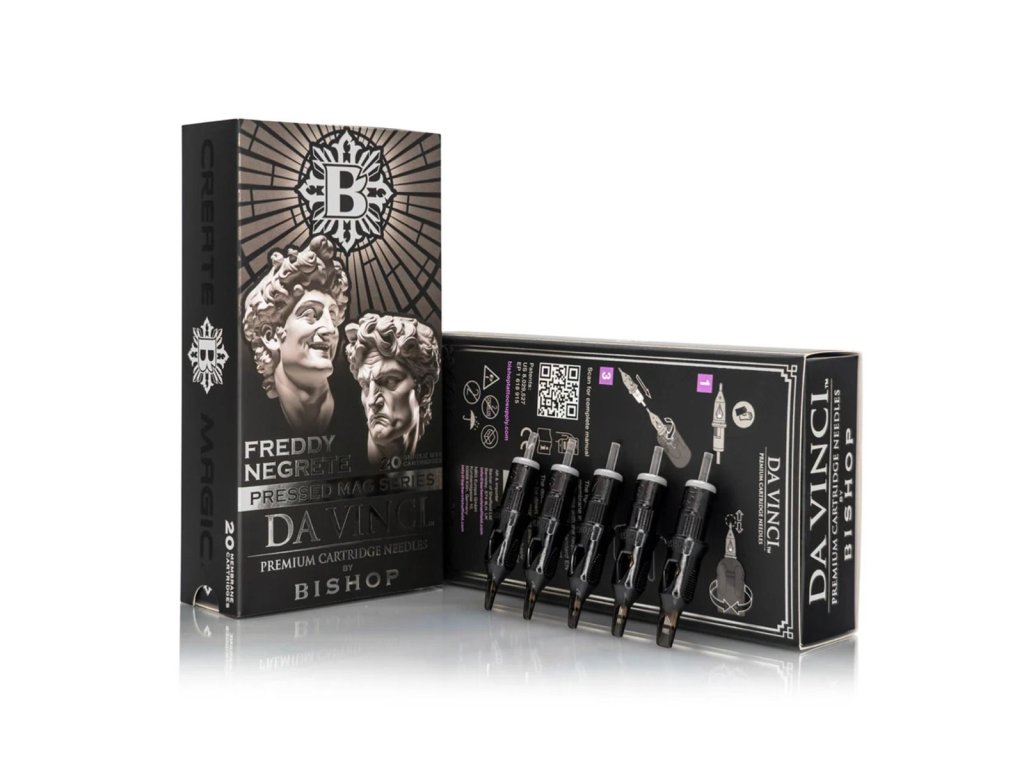 Cartridge Bishop DaVinci x Freddy Negrete Curved Pressed Magnum posouvají hranice práce s magnum jehlami. Díky „pressed“ konstrukci jsou jehly stlačené blíže k sobě, což umožňuje rychlejší a přesnější plnění barvy, a zakřivený tvar přináší ještě jemnější stínování a plynulejší přechody.