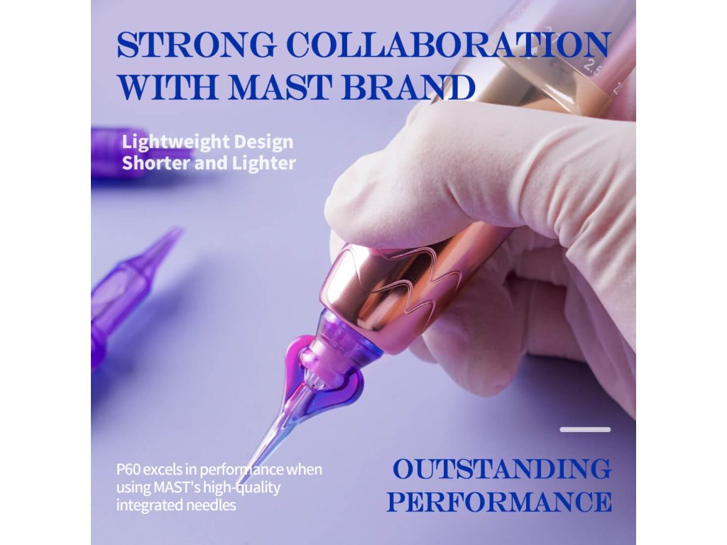 Mast P60 je elegantní, všestranný, ergonomicky a technologicky propracovaný tetovací strojek ve stylu pera. Umělci ocení elegantní design se zakřiveným displejem a protiskluzovým úchopem pro praktičnost a estetiku.