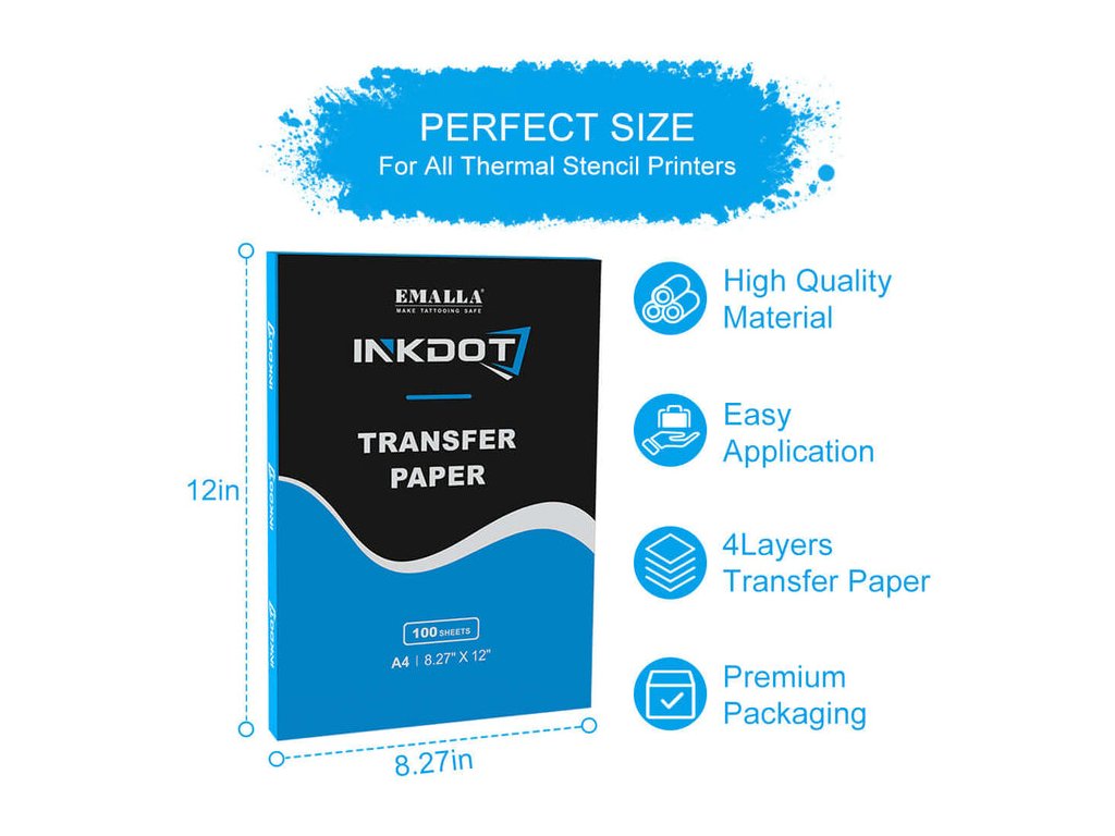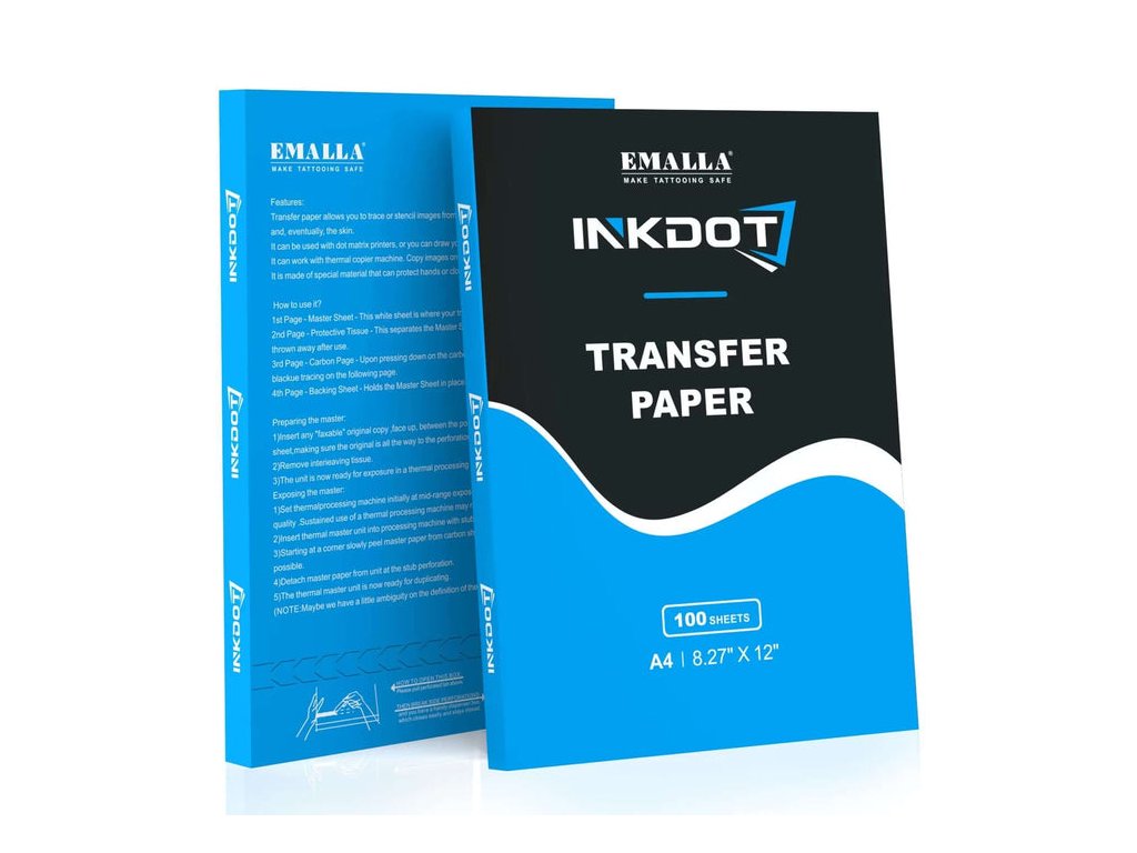 Přenosový papír EMALLA INKDOT je navržen pro profesionální použití při přípravě stencilů v tetovacích studiích. Papír umožňuje přesný přenos linií i jemných detailů návrhu a je vhodný jak pro práci s termotiskárnou, tak pro ruční kresbu.
