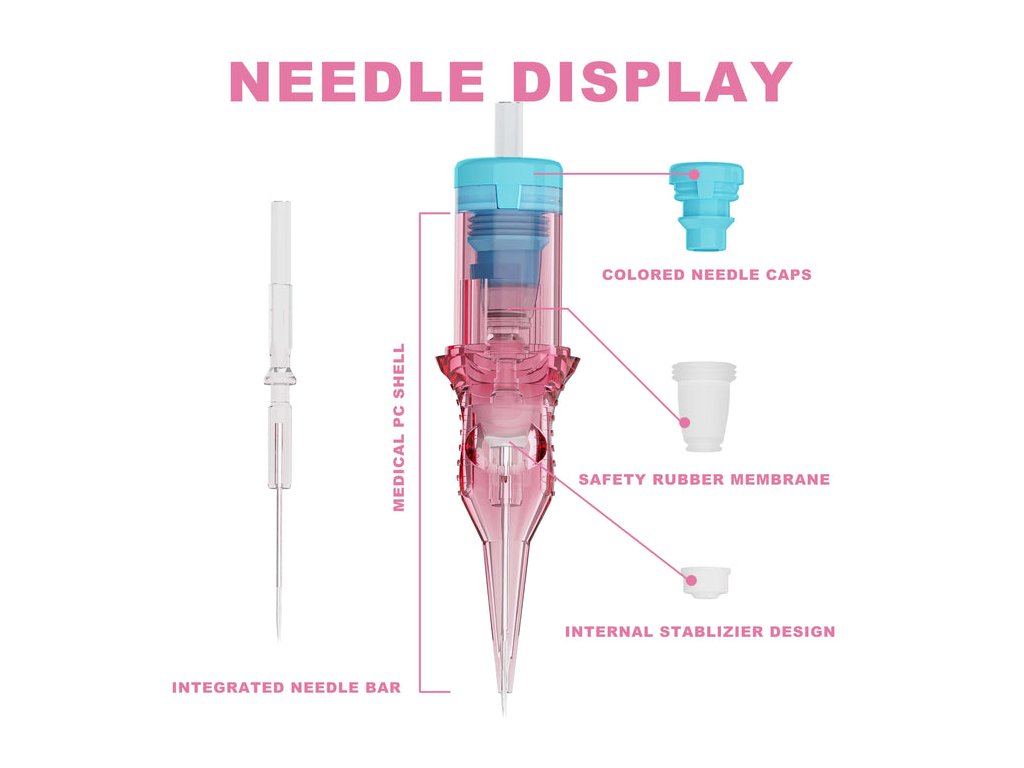 Cartridge jsou vybaveny bezpečnostní membránou, která omezuje zpětný tok pigmentu a tekutin do strojku. Tělo cartridge je vyrobeno ze zdravotnického plastu a jehla z chirurgické nerezové oceli. Každá cartridge je jednotlivě balena a sterilizována EO plynem.