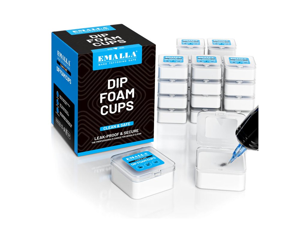 Pěnové krabičky EMALLA Tattoo Dip Foam Cups slouží k průběžnému čištění jehel a cartridgí během práce bez nutnosti použití papírových utěrek nebo opakovaného oplachování. Vnitřní pěnová vložka absorbuje přebytečný inkoust a umožňuje rychlou změnu barvy při zachování plynulosti práce.
