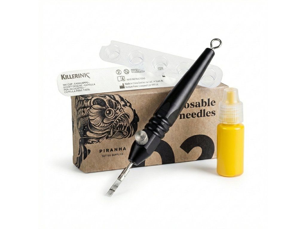 Sada kombinuje nástroj, jehly, kalíšky i barvu, takže usnadňuje přípravu na práci a pomáhá udržet přehled na pracovním místě. Je vhodná tam, kde je důležitá jednoduchost, rychlá orientace v pomůckách a přesné dávkování barvy.