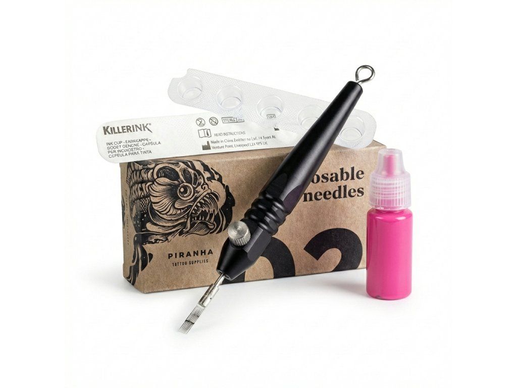 Sada kombinuje nástroj, jehly, kalíšky i barvu, takže usnadňuje přípravu na práci a pomáhá udržet přehled na pracovním místě. Je vhodná tam, kde je důležitá jednoduchost, rychlá orientace v pomůckách a přesné dávkování barvy.