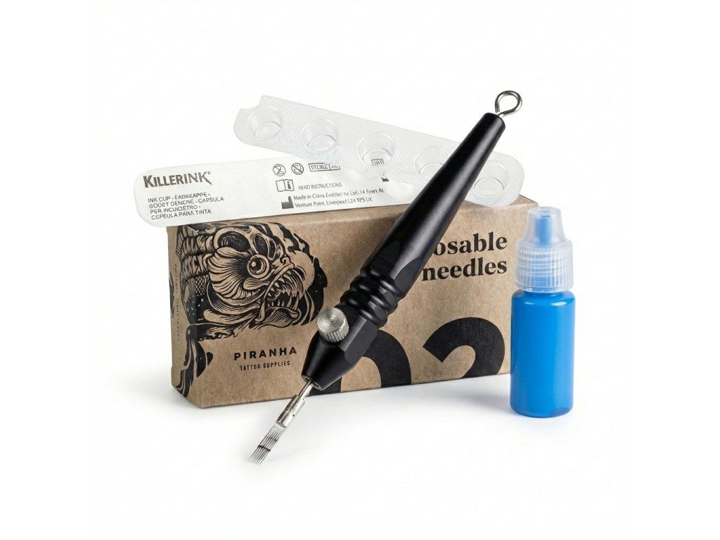 Sada kombinuje nástroj, jehly, kalíšky i barvu, takže usnadňuje přípravu na práci a pomáhá udržet přehled na pracovním místě. Je vhodná tam, kde je důležitá jednoduchost, rychlá orientace v pomůckách a přesné dávkování barvy.