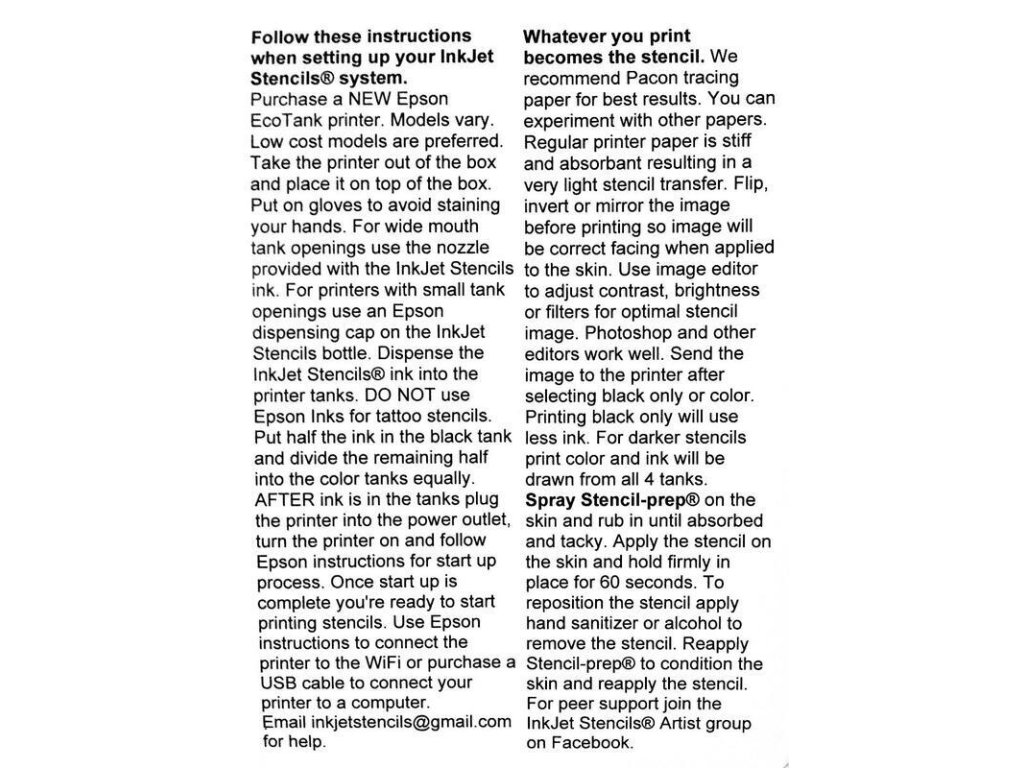 InkJet Stencils je novinka při obtiskování motivu. Jde o speciální inkoust, který se aplikuje přímo do inkjet tiskárny EPSON EcoTank (nezávisle na modelu). Vybraný, upravený motiv můžete jednoduše obtisknout na speciální nebo standardní papír a obtisknout na pokožku. Velkou výhodou je nesrovnatelná kvalita obtisků, které nelze dosáhnout standardními metodami. Objem 120ml dokáže vytisknout až 3000 výtisků. Výjimečná kvalita obtisků, perfetkní detaily 100% Vegan vystačí až na 3000 výtisků Vyrobeno v USA kompatibilní s tiskárnami Epson EcoTank doporučujeme použít v nové tiskárně (nesmí se míchat s klasickým inkoustem do tiskárny) - viz anglický návod foto
