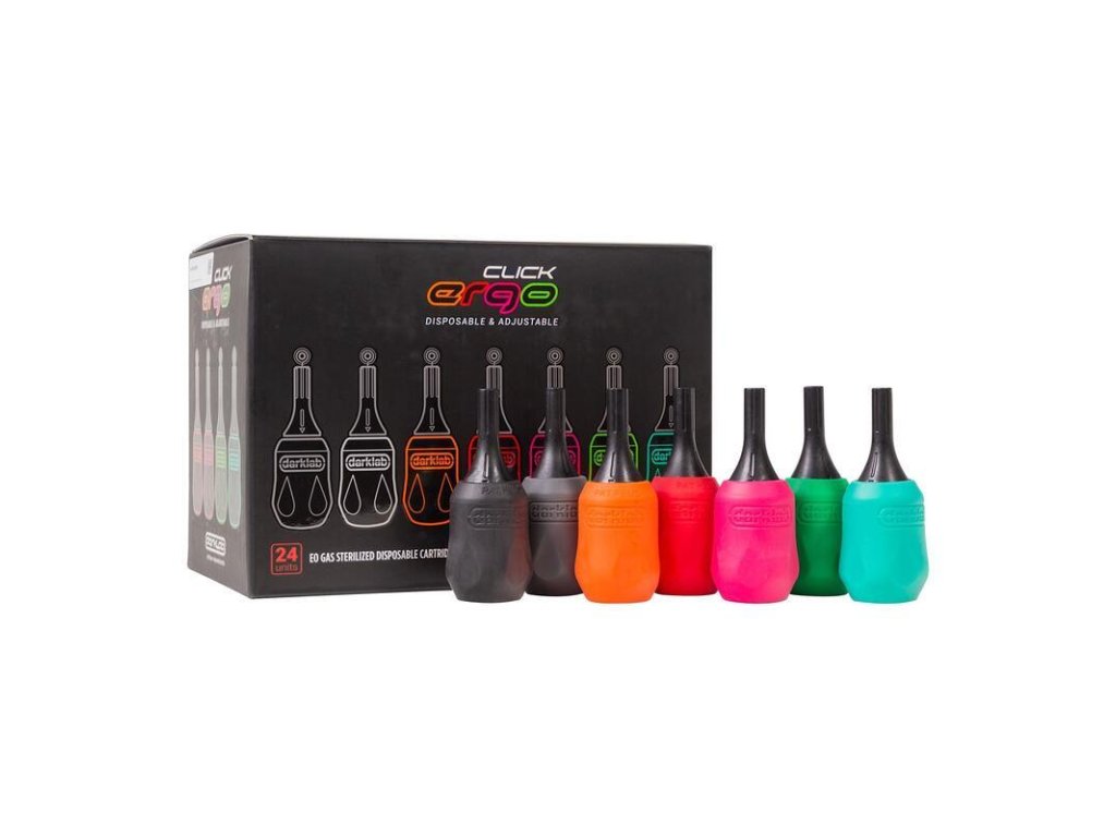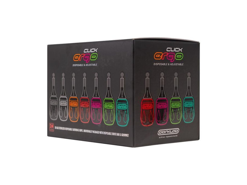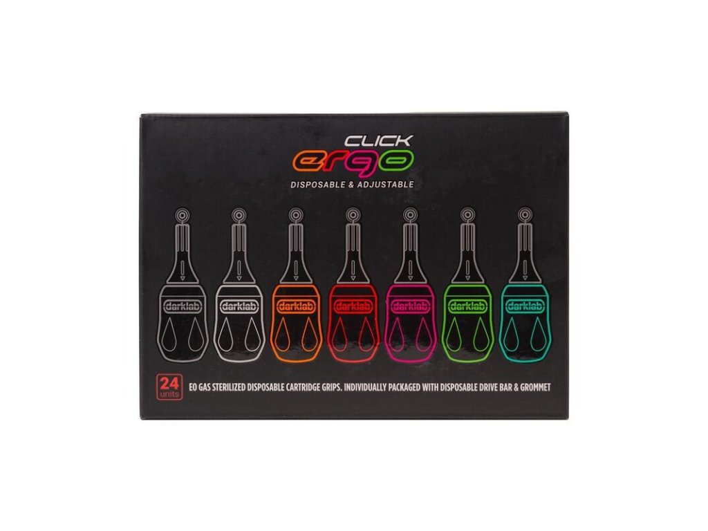 Jednorázový grip Click Ergo byl designován s důrazem na ergonomii a obsahuje systém Ratchet Disc. Tento systém umožňuje nastavení hloubky jehly pouhým otočením gripu až 4mm. Jakmile je hloubka jehly nastavena, systém nastavitelného gripu zabraňuje jeho otočení i při použití těžkých tetovacích strojků. Průměr Click Ergo gripu je od 25 - 32mm pro optimální komfort pro každou ruku. Také díky konstrukci umožňuje tatérovi dostat se blízko ke cartridgi pro maximání přesnost a kontrolu při zachování standardní malovací pozice. Ergonomie gripu také snižuje únavu ruky. 3 mm centrální otvor je kompatibilní se všemi tetovacími strojky s vestavěným táhlem. Klíčové vlastnosti: různé barevné provedení, sterilně balené nastavitelná hloubka jehly: 0 - 4 mm průměr: 32 mm v nejširším bodě ergonomický design made in USA
