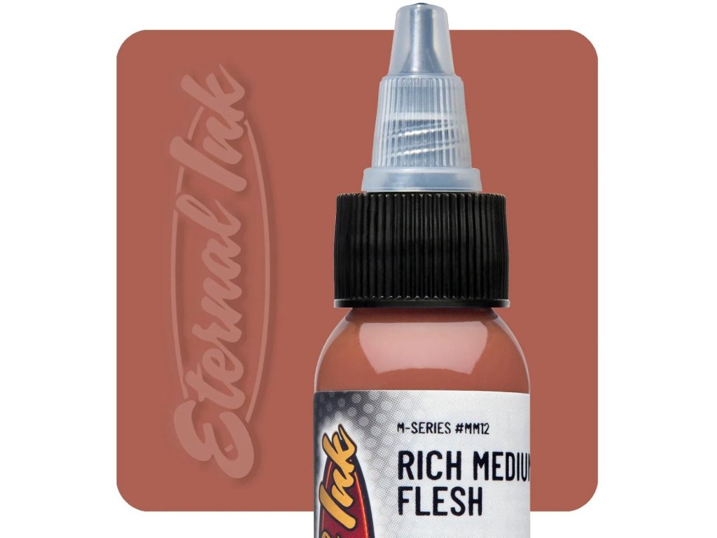 Eternal M Series Rich Medium Flesh představuje ideální střední odstín pro portrétní tetování. Jeho bohatá barva vyniká samostatně, ale zároveň se výborně kombinuje s dalšími tóny, což umožňuje plynulé přechody mezi světly a stíny. Tento odstín je jedním z 18 tónů série M, kterou navrhli renomovaní portrétní tatéři Mike DeVries a Mario Rosenau.