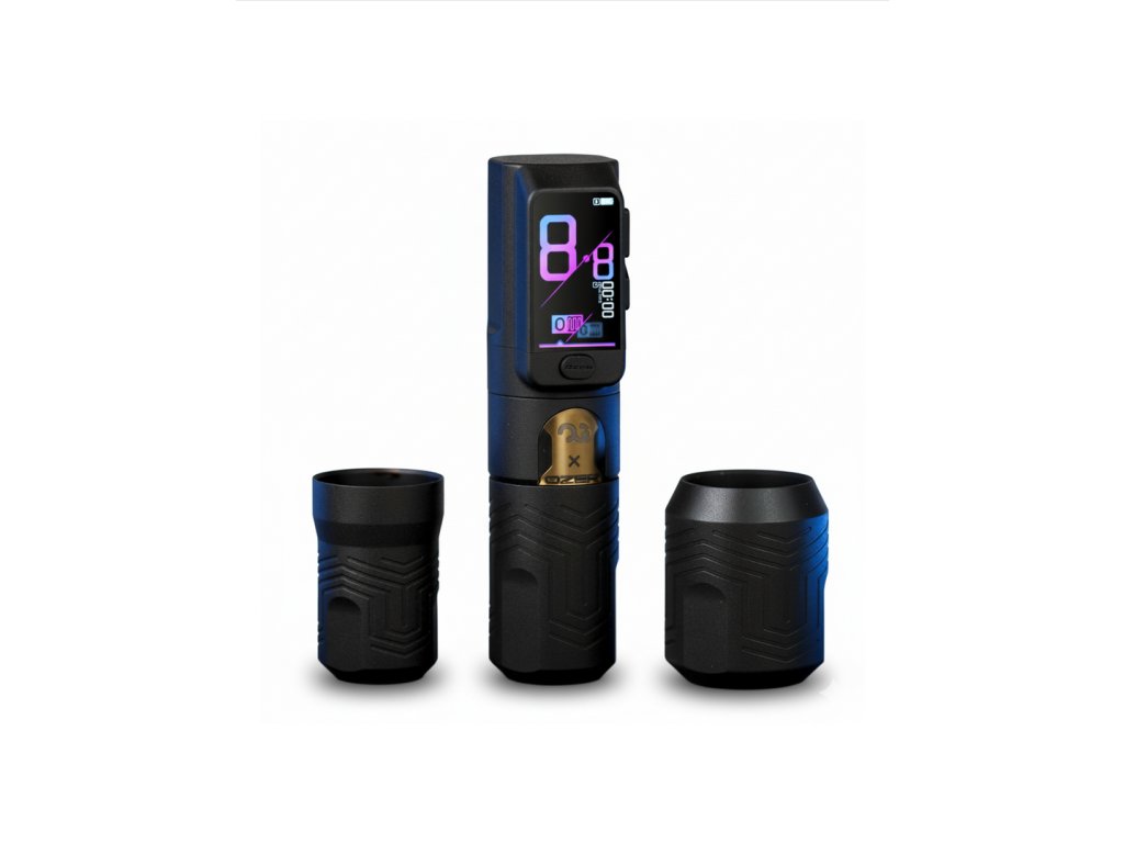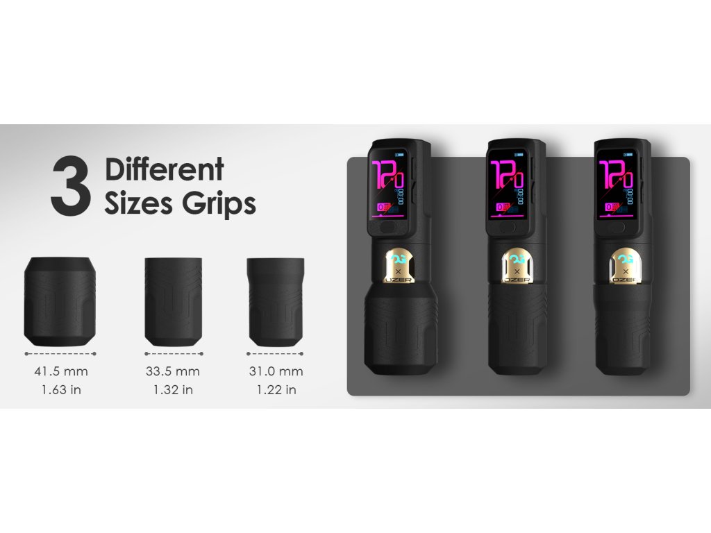 Tři vyměnitelné gripy různých velikostí (31 mm, 33,5 mm a 41,5 mm) umožňují každému tatérovi zvolit optimální úchop podle osobních preferencí. Integrované bezpečnostní prvky a výkonný bezkartáčový motor se start-boost režimem poskytují stabilní výkon od prvního momentu.