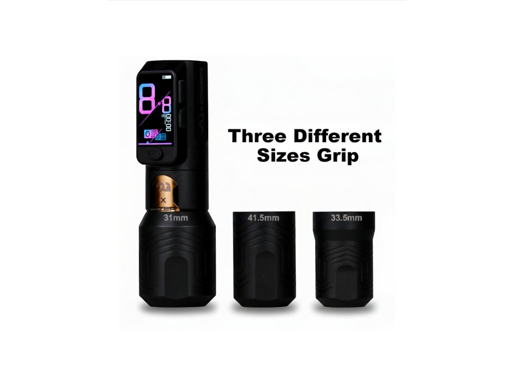 Tři vyměnitelné gripy různých velikostí (31 mm, 33,5 mm a 41,5 mm) umožňují každému tatérovi zvolit optimální úchop podle osobních preferencí. Integrované bezpečnostní prvky a výkonný bezkartáčový motor se start-boost režimem poskytují stabilní výkon od prvního momentu.