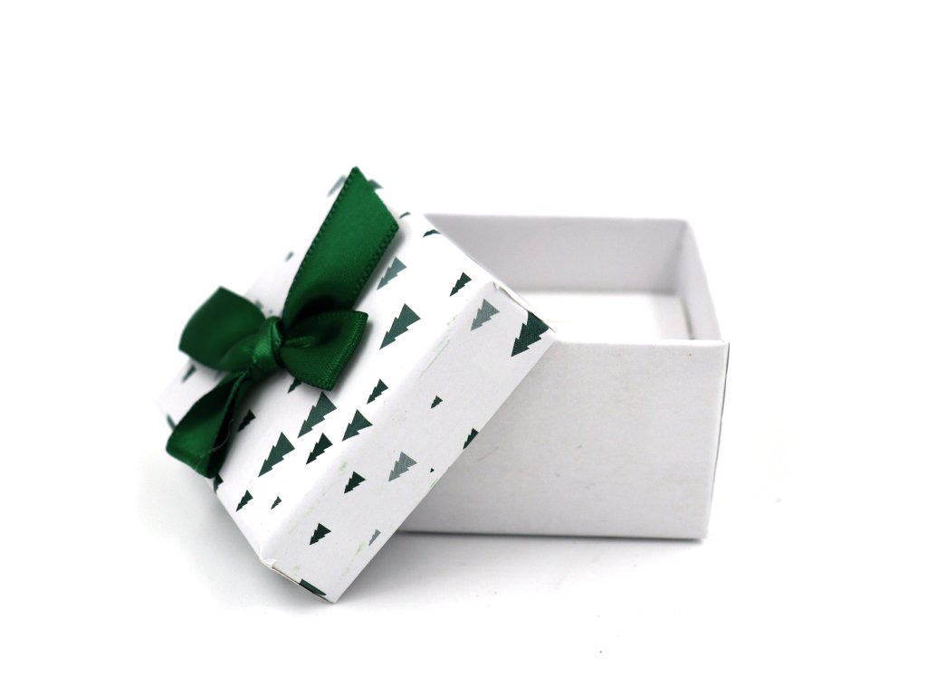 Elegantní papírová krabička s decentním vánočním motivem je ideální pro dárkové balení šperků a piercingů. Kombinuje čistý bílý základ s jemným potiskem stromečků a ozdobnou zelenou mašlí, která dodává celému balení slavnostní vzhled. Uvnitř se nachází měkká molitanová vložka s výřezy, které bezpečně drží šperk na místě a chrání ho před poškozením.