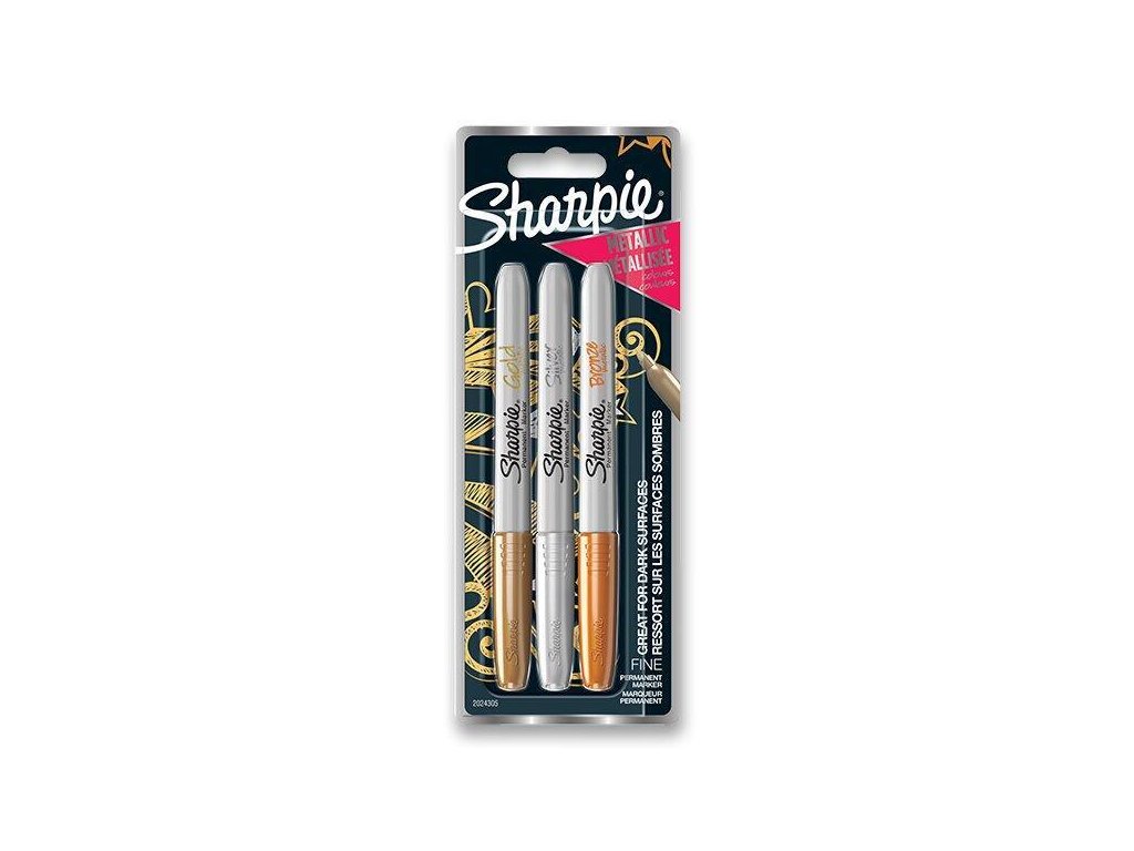 Popisovač s permanentním inkoustem na většinu světlých i tmavých povrchů. Sada obsahuje 3 metalické barvy s hrotem 1,4 mm. Délka stopy cca 225 m. na všechny druhy papíru, karton, plast, dřevo, textil, keramiku a porcelán rychle zasychá odolný vůči vodě a světlu po dokončení nutná fixace vyrobeno v USA šedé plastové tělo, víčko a koncovka v barvě náplně kulatý hrot 1,4 mm Trvalost a intenzita barev grafiky závisí na zvoleném materiálu a barvě popisovače. K dosažení trvalého efektu je nutné povrch před použitím popisovače očistit a odmastit a hotovou grafiku zafixovat způsobem vhodným pro zvolený materiál: porcelán a keramika - fixace vypálením v troubě při 200 °C po dobu přibližně 30 minut textil - fixace přežehlením na nízkou teplotu bez použití páry a přes další látku dřevo, kameny - fixace transparentním lakem před a po použití popisovače. Při použití Sharpie Metallic není možné zaručit trvalost a intenzitu barev plasty - fixace bezbarvým lakem