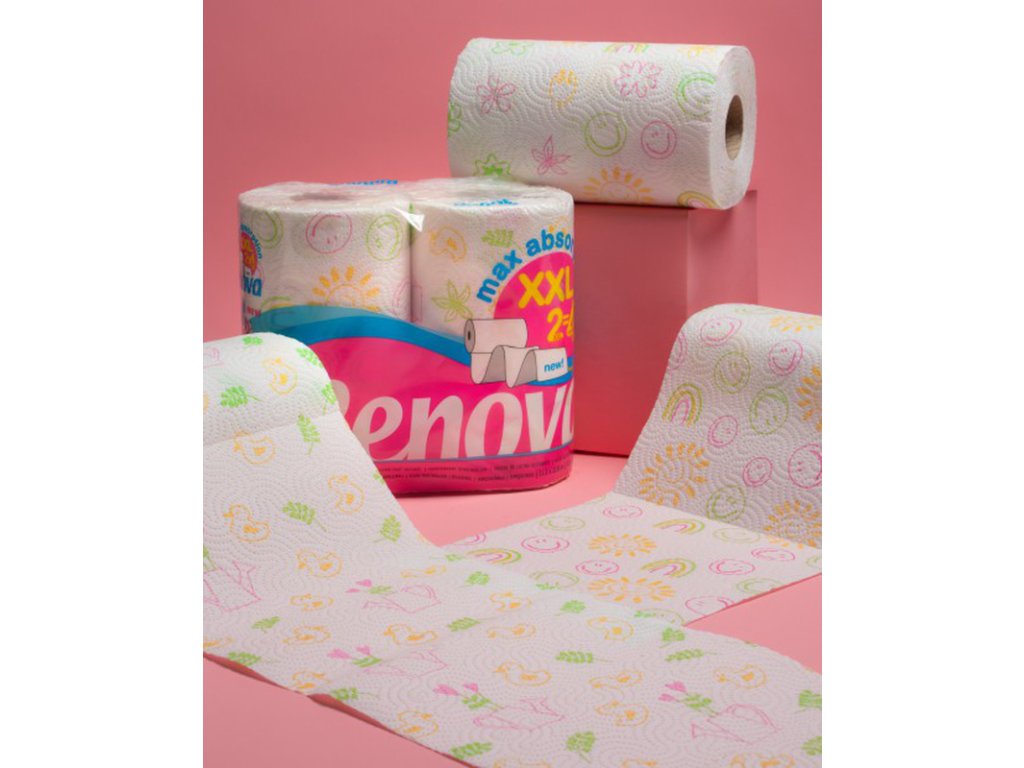Papírové utěrky RENOVA v jarním designu jsou vyrobeny technologií HYDROFLOW, která zajišťuje rychlou absorpci a zadržení tekutin uvnitř struktury papíru. Díky 2vrstvému provedení jsou pevné i při namočení a vhodné pro intenzivní používání během práce.