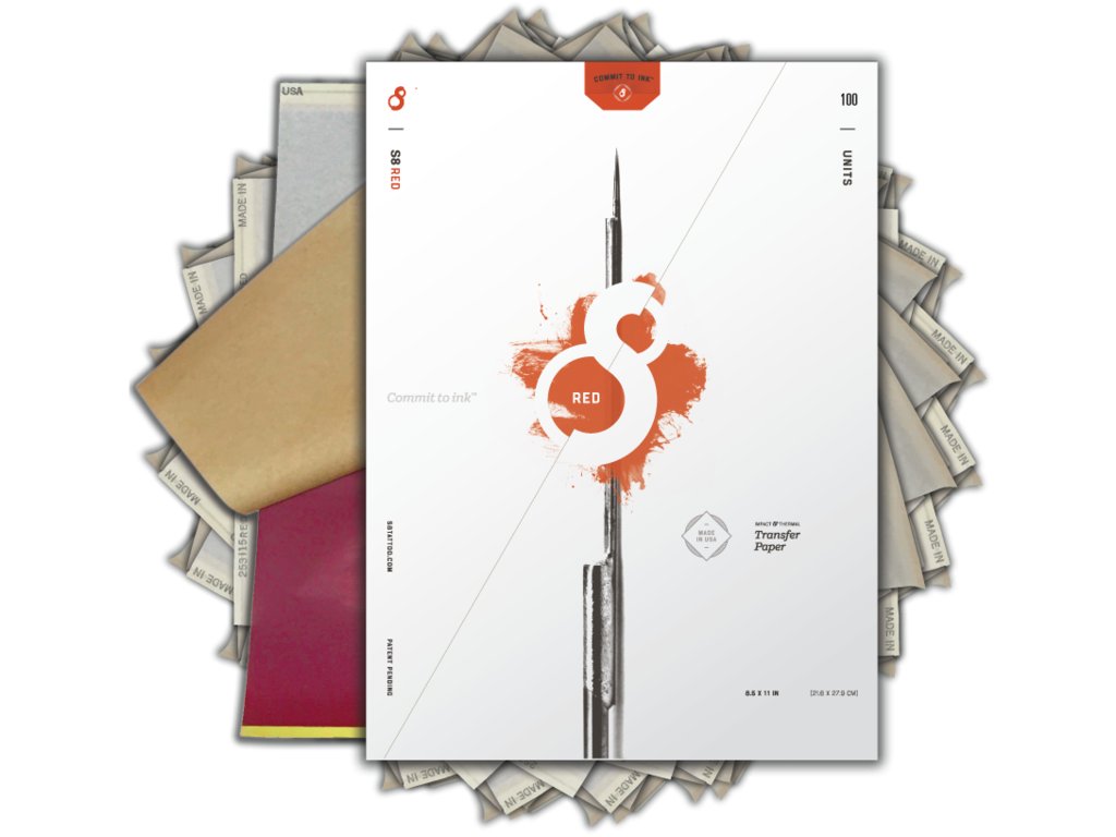 První červeně barvící kopírovací papír na světě Červená barva ideální pro linkování FD&C a D&C schválené složení barev, které je bezpečné a určené pro všechny typy pokožky Vhodná pro termotiskárny, kopírky a tiskárny Obtisk vydrží dlouho na kůži Kompatibilní se všemi produkty S8 RED Nothing short of revolutionary: S8's RED Stencil Paper is the world’s first impact and thermal ready red colored tattooing stencil paper. For years, tattoo artists have intuitively known that red is the ideal stenciling color for light skin tones thanks to the fact that red provides greatest degree of visual separation when black-lining. However, stencil paper manufacturers have been unable to produce a thermal machine-ready red paper. Until now. A patent-pending blend of FD&C and D&C approved red colorants that are safe and approved for use on all skin types and mineral and vegetable waxes means unparalleled tattoo stencil performance. When used with other S8 products -like the RED Stencil Transfer Gel and RED Tattooing Gel- RED Stencils will last longer than all competitors. And thanks to S8's system minded approach, RED doesn’t smear, smudge or wipe away until you want it to. The 100 unit box is designed for large shops and hard-working artists. Our largest sized box has great value and helps shop managers, artists, and owners track supply levels. This box lays flat for easy storage near the printer or Thermofax, and protects paper when not in use. MADE IN THE USA PATENT PENDING VEGAN