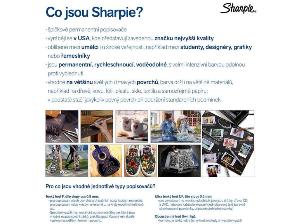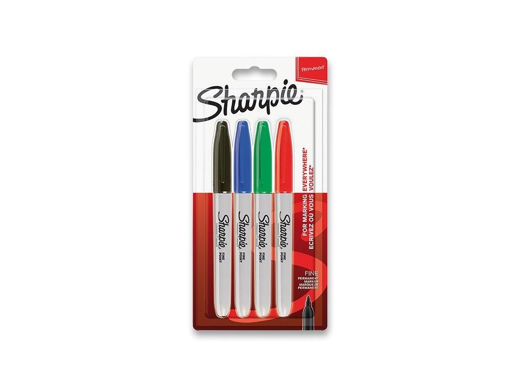 Sada 4 fixek Sharpie s tenkou špičkou 0,9mm Ideální pro tenké detailní linky. Sharpie fixy rychle usychají a velmi dobře drží na většině povrchů jako je kůže, kov, sklo, plast, folie, guma, voskovaný papír, film a další... Klíčové vlastnosti: klipy na fixách - snadné uchycení na kapse voděodolný inkoust rychle schnoucí inkoust neobsahuje xylen a toulen jasné barevné a odolné barvy na většinu povrchů tenká špička