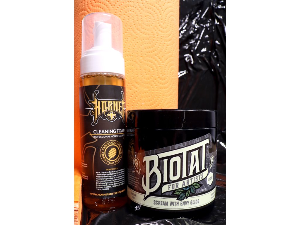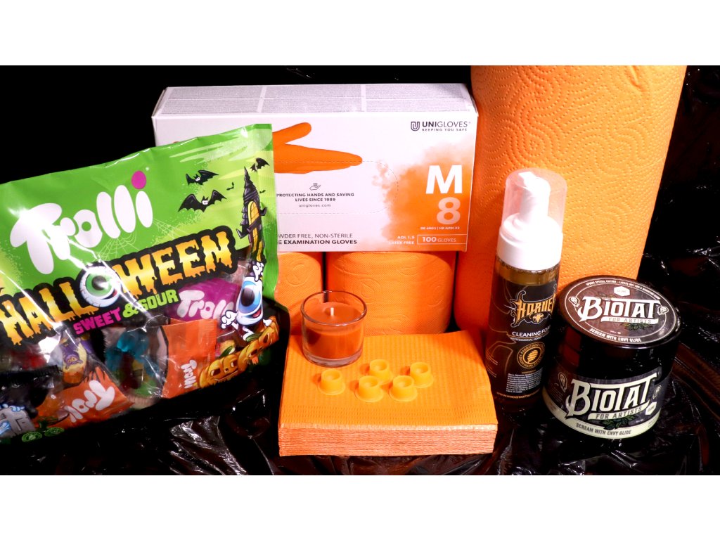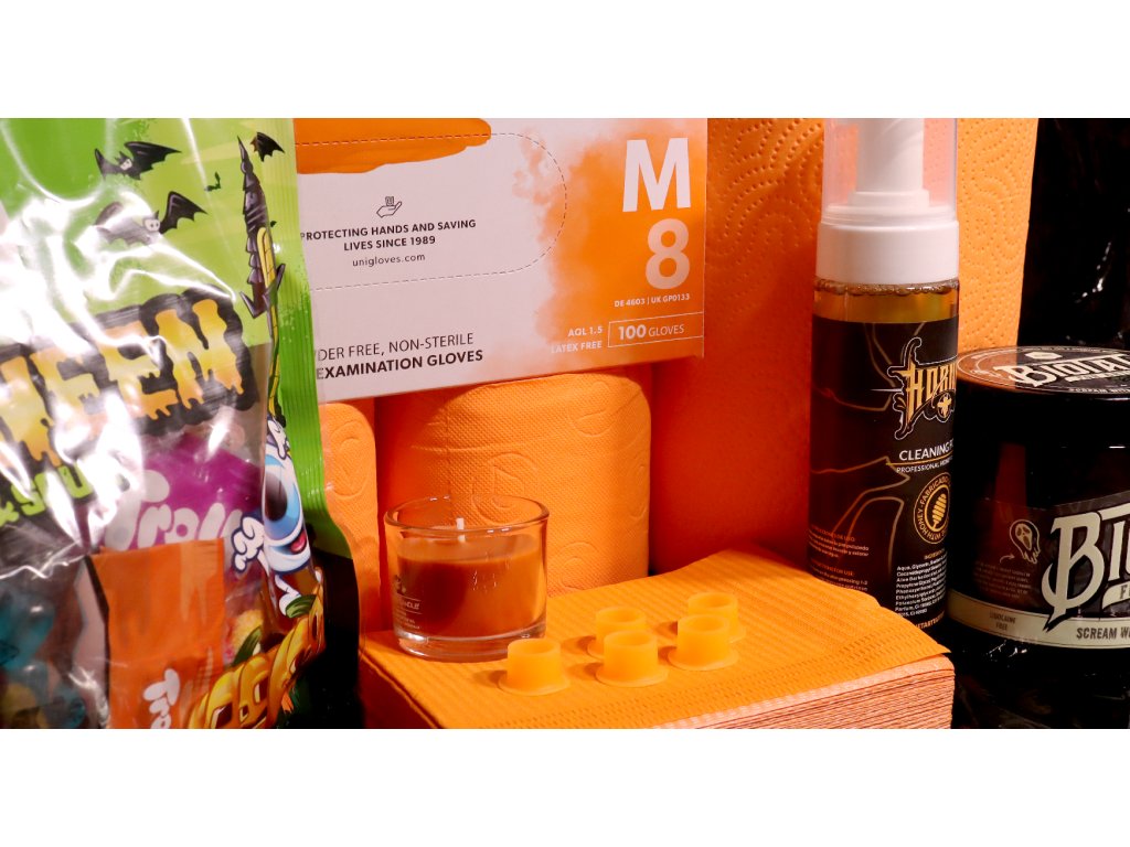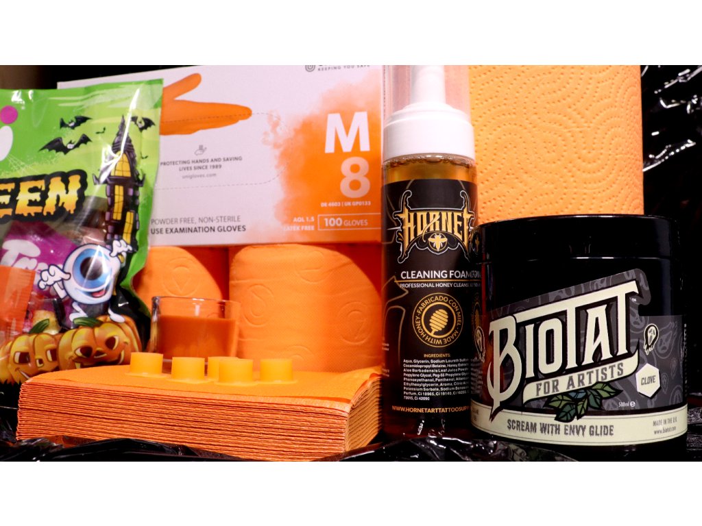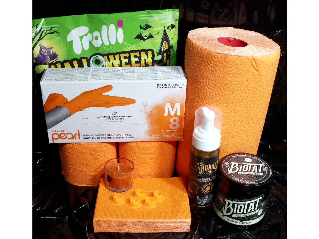 Spooky Pumpkin Pack je ideální volbou pro studia, která chtějí mít pracovní prostor sladěný s halloweenskou náladou. Oranžové barvy podložek, rukavic a papírových utěrek doplňuje vonná svíčka Yankee Candle s vůní Pumpkin Cinnamon Swirl, která vnese do prostoru hřejivou podzimní vůni. Součástí balíčku je i BIOTAT Scream s Glide Envy gel – limitovaná edice znecitlivujícího pracovního gelu ve 500g balení. Pack doplňují sterilní silikonové kalíšky The Inked Army a tematické sladkosti Trolli Halloween Party Mix.