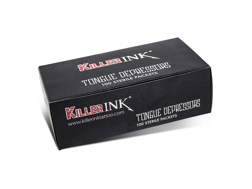 Krabice se 100 sterilními špachtly Killer Ink. Každá špachtle je zabalená jednotlivě a sterilizována EO plynem.