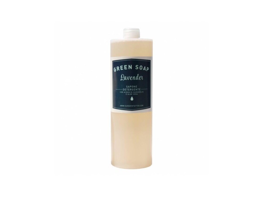 Antibakteriální a hypoalergenní mýdlo s vůní levandule. Ideální pro čištění pokožky před a po tetování. Podporuje hojení a regeneraci pokožky a roztok z vilínu lékařského, která má dekompresní vlastnosti, snižuje krvácení a svrbení. Odstraňuje zarudnutí a otoky. Nedráždí pokožku - pH neutrální. Koncentrát 1: 5 - přidejte 4L vody k 1L mýdla.