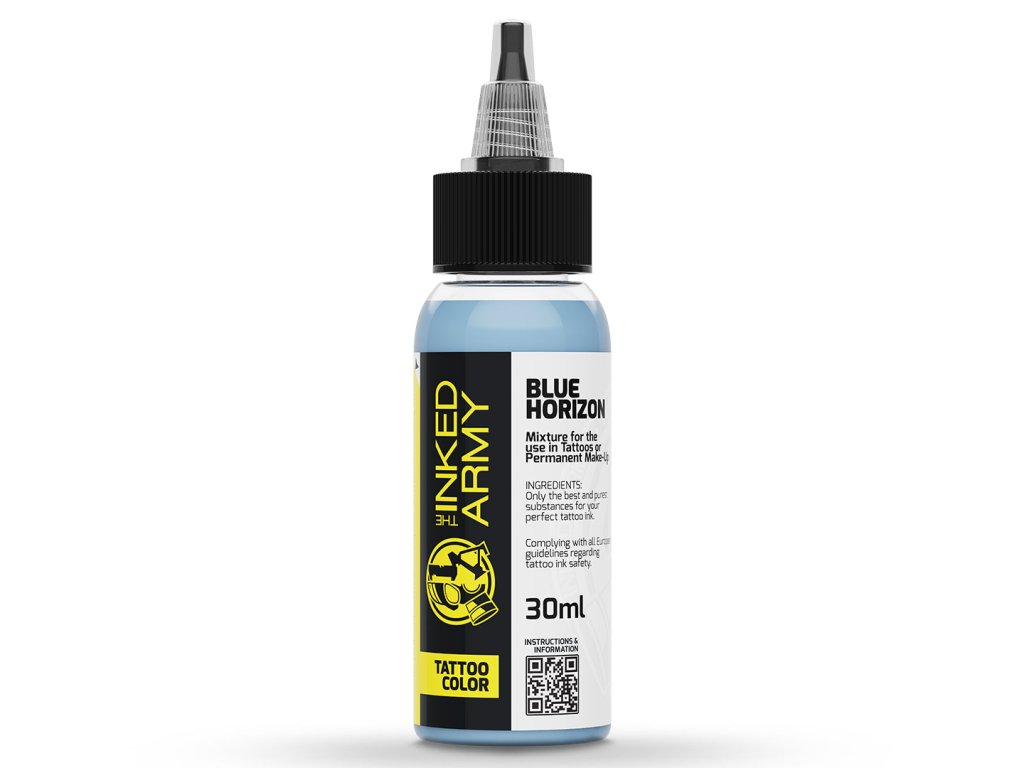 THE INKED ARMY Blue Horizon je výrazná modrá ze série profesionálních tetovacích barev vyráběných v Německu. Nabízí čistý, stabilní odstín a rovnoměrné usazení pigmentu, což umožňuje precizní práci při výplních i barevných detailech.