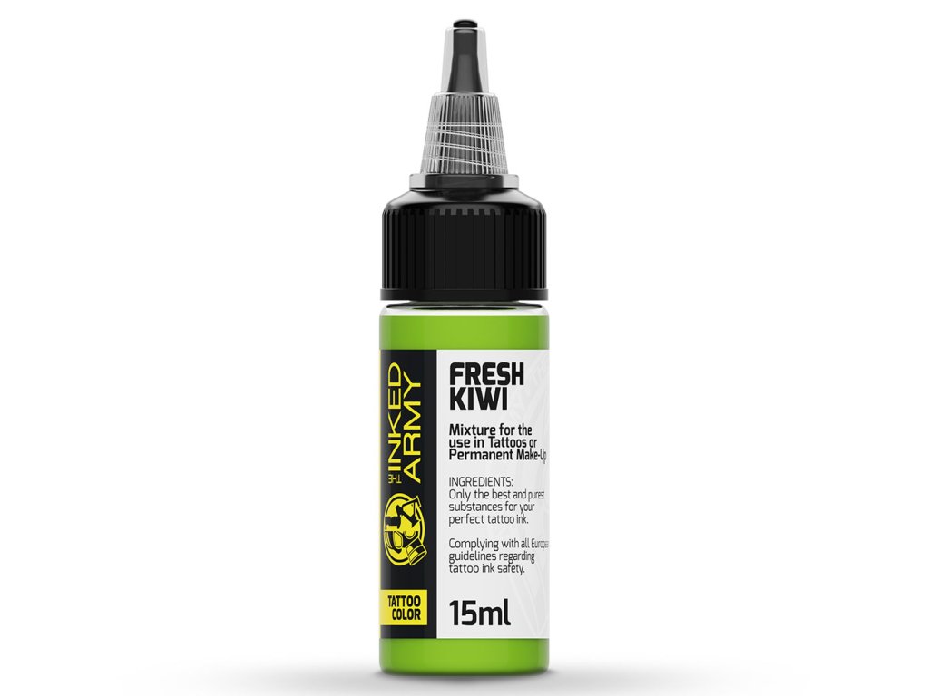 THE INKED ARMY Fresh Kiwi je jasný zelený odstín inspirovaný barvou čerstvého kiwi. Nabízí čistý, energický tón, který vynikne jak v plných výplních, tak v detailních barevných prvcích.