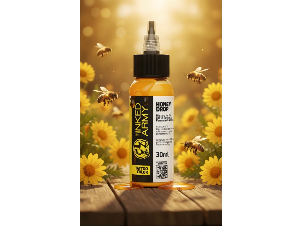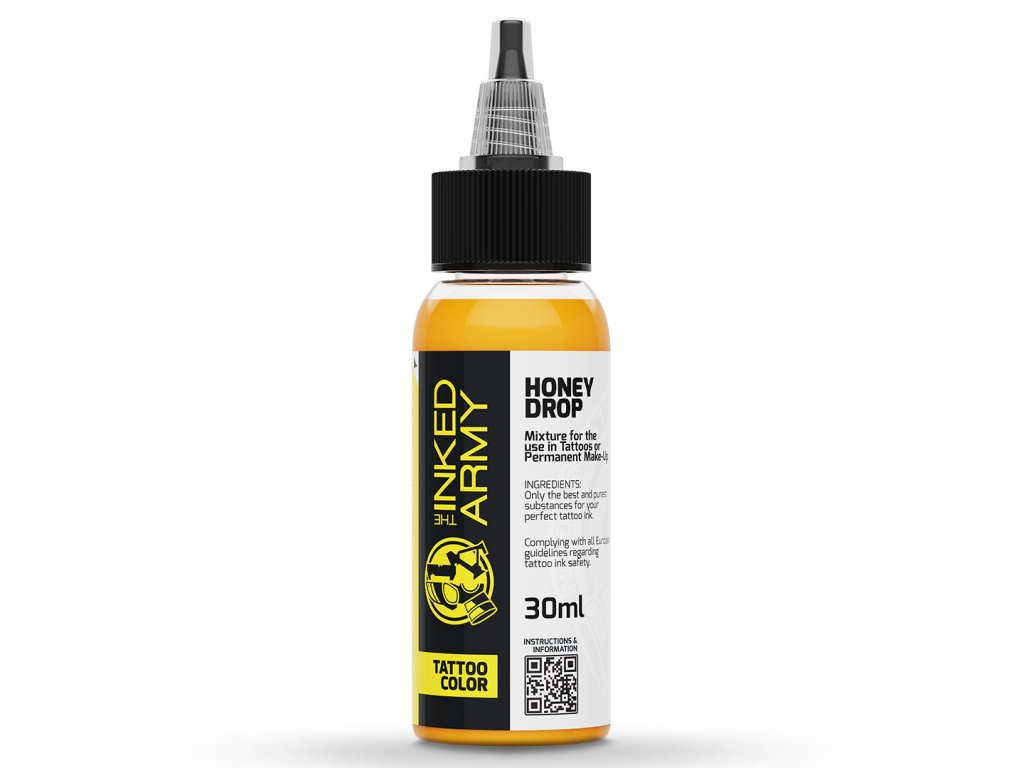 THE INKED ARMY Honey Drop je zářivý žlutý odstín inspirovaný barvou tekutého medu. Nabízí čistý a stabilní tón, který se uplatní při tvorbě světlých detailů, barevných přechodů i plných výplní.
