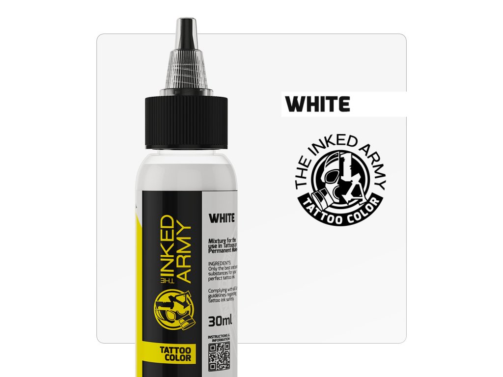 THE INKED ARMY White je intenzivní bílá tetovací barva určená pro čisté krytí, světelné akcenty a zesvětlení detailů. Díky vyvážené konzistenci nabízí stabilní průtok a rovnoměrné usazení pigmentu, což umožňuje přesnou a kontrolovanou práci.