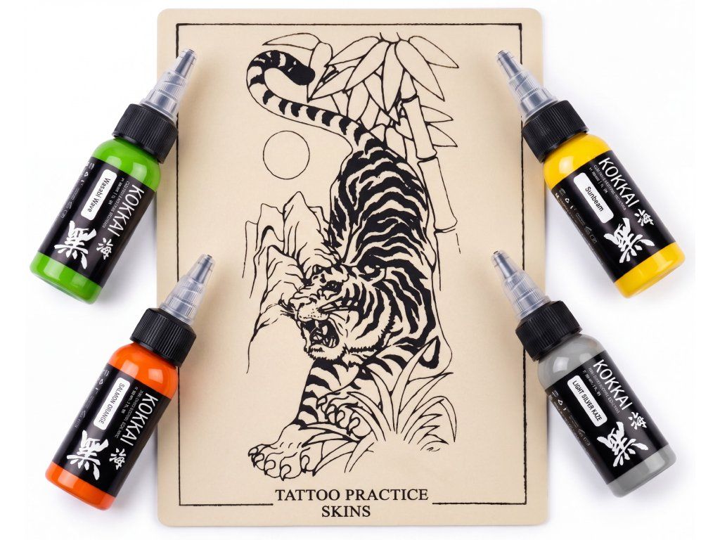 Kokkai Sumi Ink sada spojuje 4 barevné odstíny a tréninkovou kůži s předtištěným motivem tygra. Hodí se pro nácvik vedení linek, stínování, výplně i práce s kontrastem na umělé kůži.