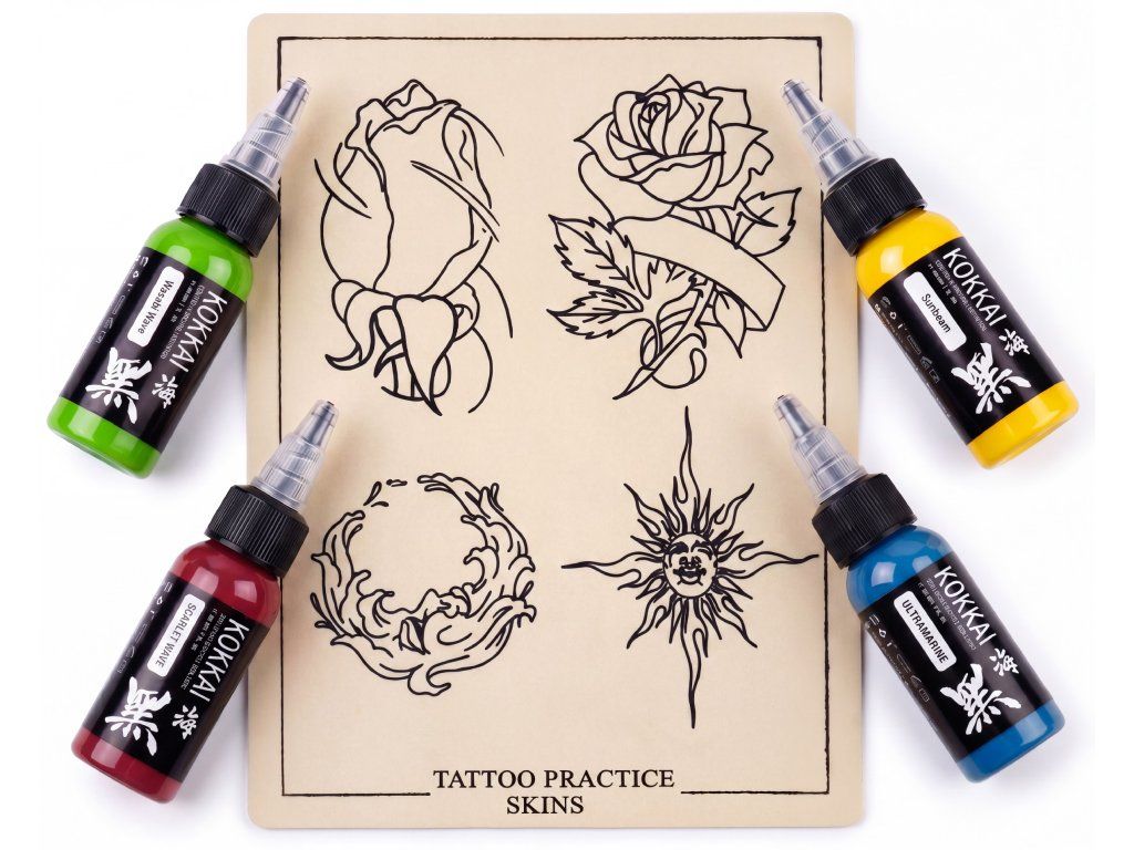 Kokkai Sumi Ink sada kombinuje 4 barevné odstíny a tréninkovou kůži s předtištěnými motivy růží, ornamentu a slunce. Hodí se pro nácvik čistých linek, výplní, přechodů a práce s kontrastem na umělé kůži.